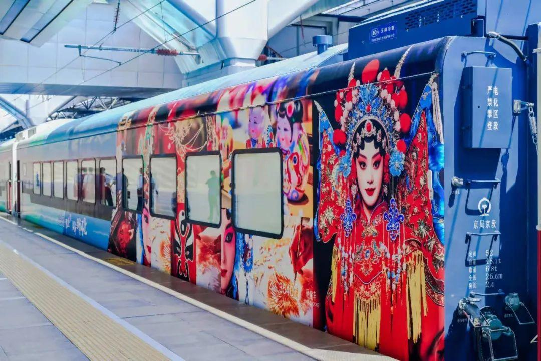 据悉,中车唐山公司创新功能设计,使“星光·燕赵号”旅游列车实现从“交通工具”向“移动观景客厅”华丽蜕变。列车外观采用蓝色渐变色系设计,融入京剧等传统艺术图案、北京河北古建筑纹样和京津冀协同发展的现代图景等元素,各车厢通过差异化视觉叙事共同构建起流动的文化长廊。列车编组7辆,包含全景观光车、多功能娱乐车、主题餐车及4节观光车,载客量216人,形成集观光、餐饮、娱乐于—体的移动文化空间。