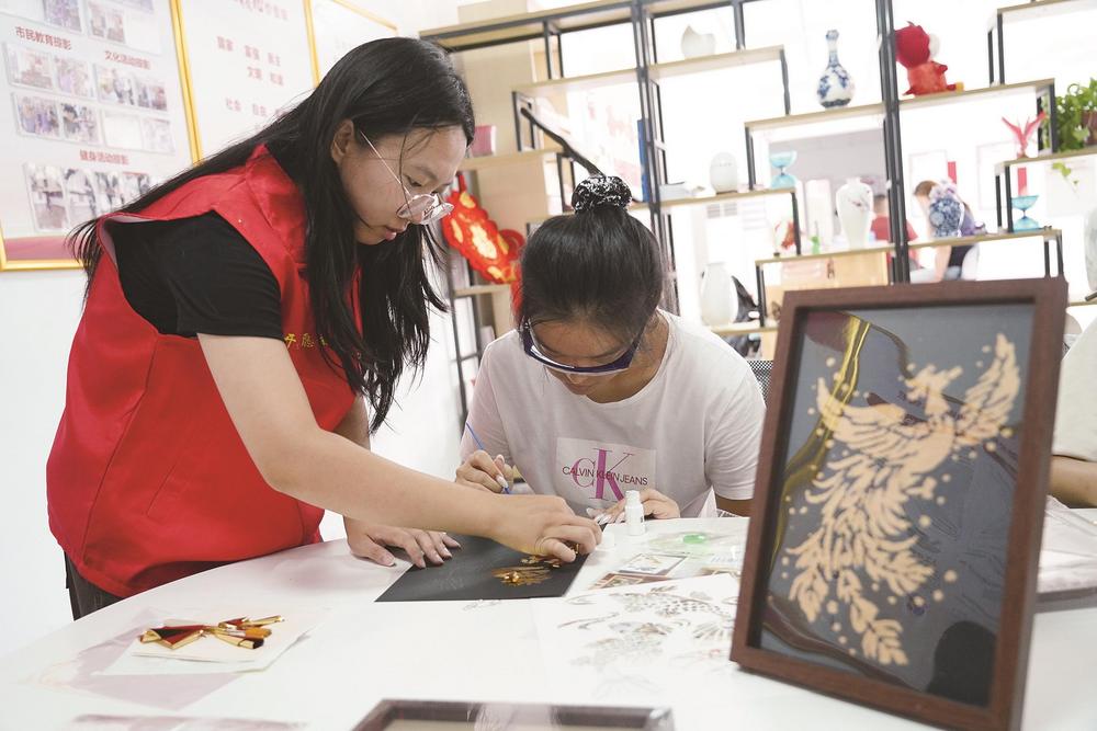 活动中,大学生化身“小导师”,一对一带领小学生体验非遗手工金箔画创作,近距离感受古老艺术的魅力。