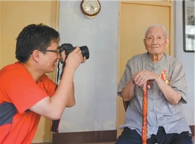 戚辉(左)在为一位八路军老战士拍照。苏晓明 摄